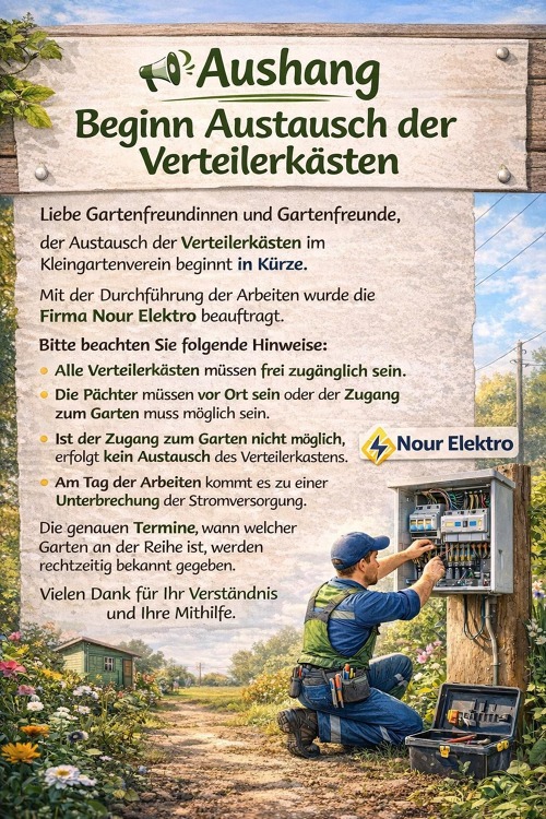 in unserer Kleingartenanlage beginnt in Kürze der Austausch der Strom-Verteilerkästen. Die Arbeiten werden von der Firma Nour Elektro durchgeführt.