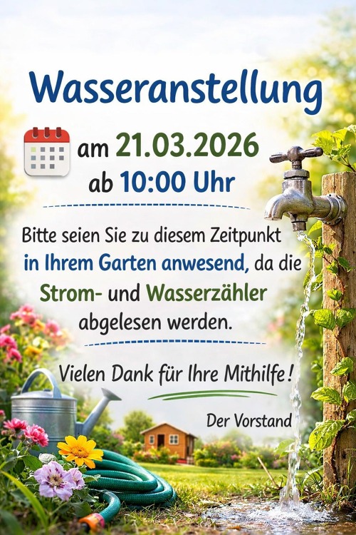 Am Samstag, den 21. März 2026, wird ab 10:00 Uhr die Wasserversorgung in unserer Gartenanlage wieder angestellt.